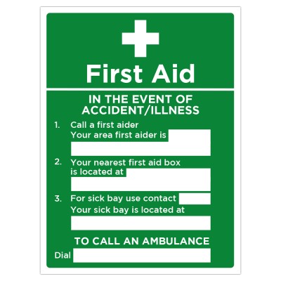 You are in: Home / Products / First Aid / Signs Signs Eye Wash Station View Eye Protection Cleaning Station View First Aid View Burns Kit View AED Emergency Defibrillator View Your Nearest Defibrillator Location View AutoMuster View First Aid Point View First Aid Information Poster View In The Event of Accident Illness View First Aid Room View First Aid Hard Hat Sticker View